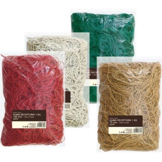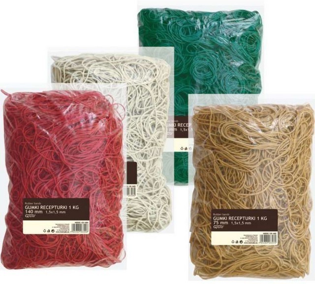 – elastyczne gumki – dostępne w 4 kolorach: naturalnym, czerwonym, zielonym oraz białym – pakowane w woreczki – rozmiar: 1,5 x 1,5 mm – średnica: 60 mm – długość po złożeniu: 9 cm – opakowanie zawiera 1 kg