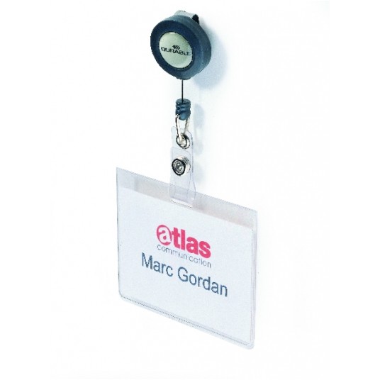 - identyfikator z zawieszką ściągającą - z wkładkami do zadrukowania - możliwość wyciągania identyfikatora na odległość do 80 cm - wymiary: 90 x 60 mm