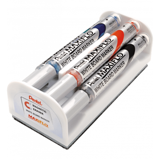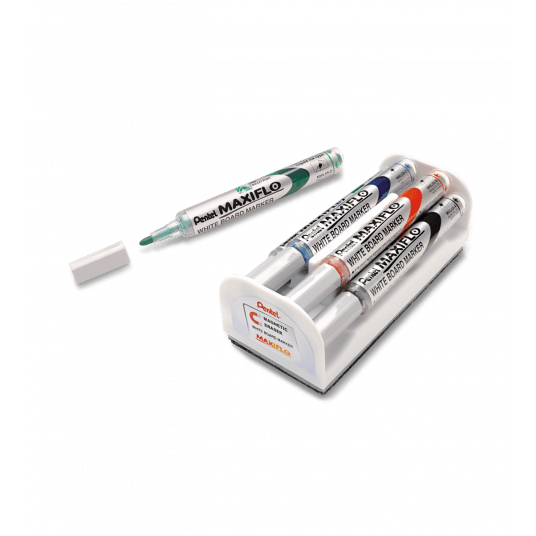 Marker MAXIFLO do białych i ceramicznych tablic. Płynny tusz dozowany w razie konieczności nawilżenia końcówki za pomocą tłoczka (zamiast tradycyjnego sączka). Marker pisze wyrazistą linią aż do ostatniej kropli tuszu. Kilkakrotnie dłuższa linii pisania niż w standardowych markerach z sączkiem - 1200 m. Nie zawiera substancji trujących ksylenu ani toluenu. Nadaje się na papier, plastik, karton, tablice suchościeralne. Zestaw MWL5S-4N zawiera 4 markery (czarny, czerwony, niebieski, zielony) oraz gąbkę magnetyczną.