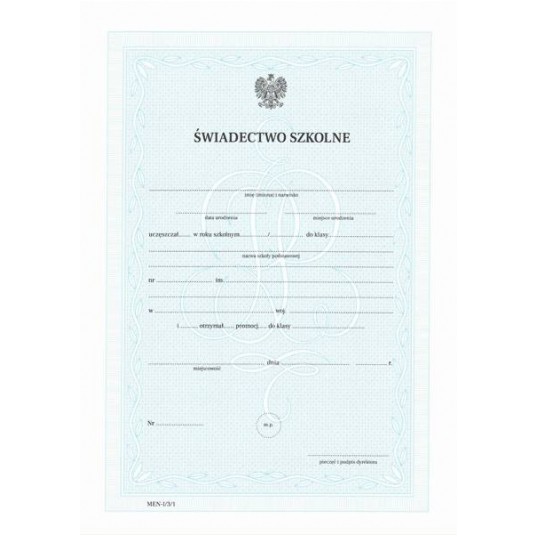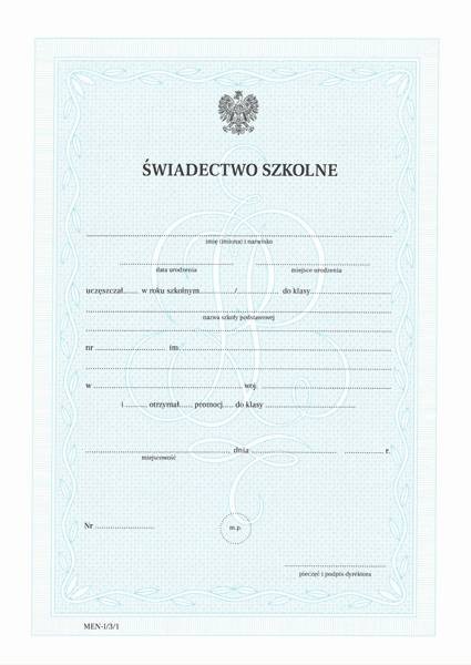 MEN-I/3/1 - Świadectwo dla uczniów klas IV - VII szkoły podstawowej dla dzieci i młodzieży Typograf A4 (2 str.)