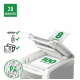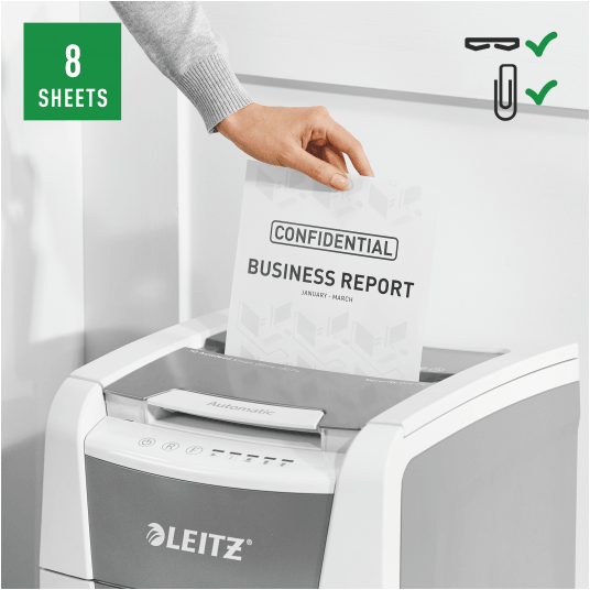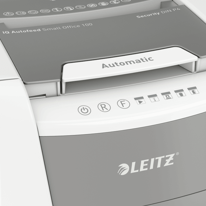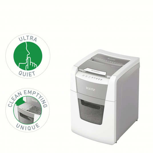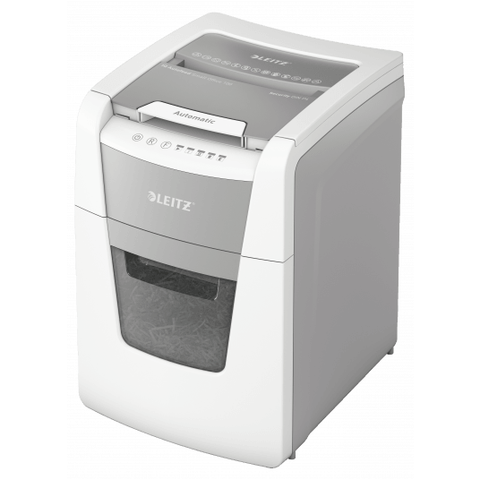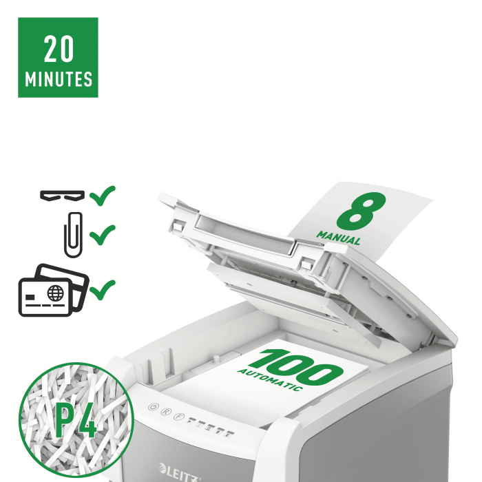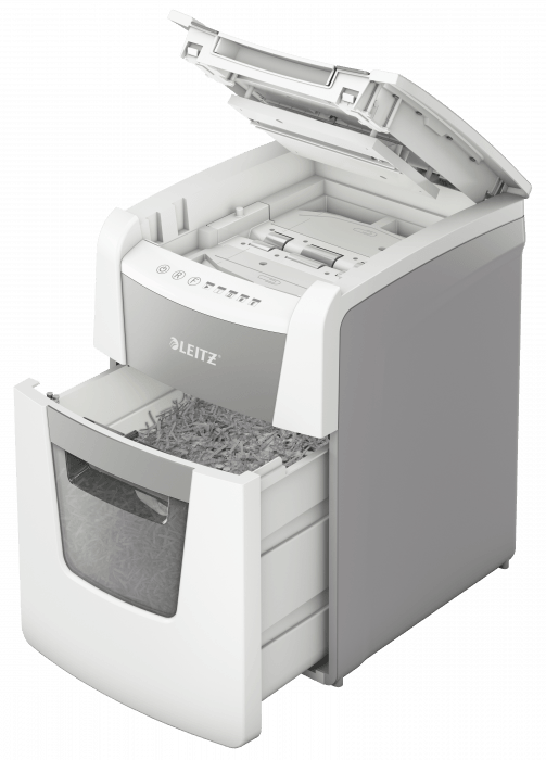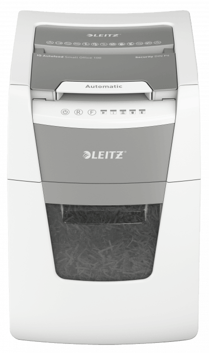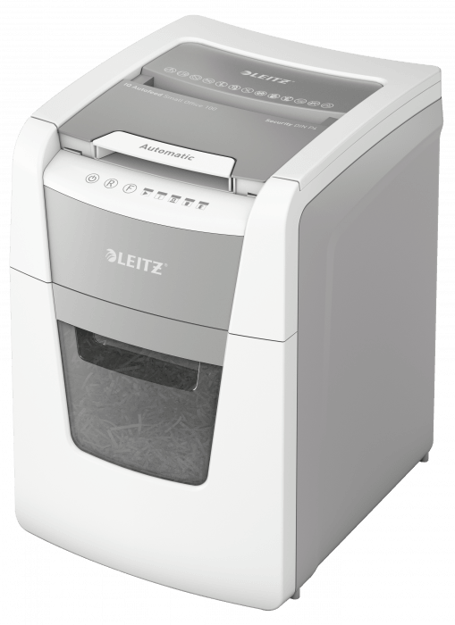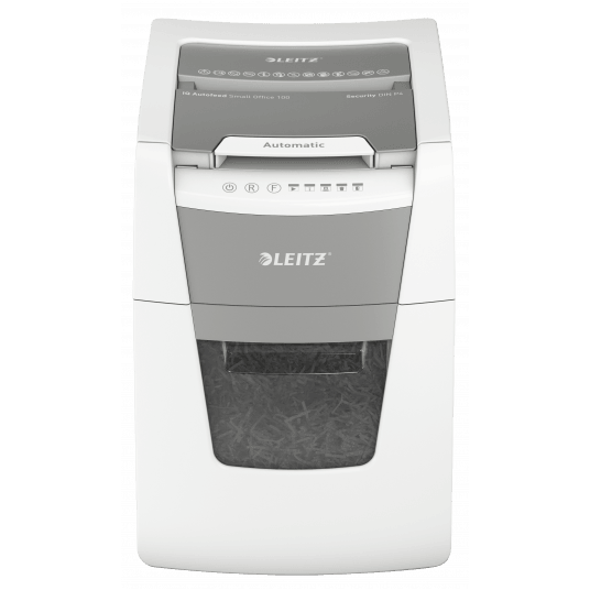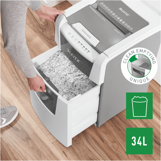 W pełni automatyczna niszczarka do papieru firmy Leitz z unikalną funkcją samooczyszczania. Tak inteligentna, że wystarczy włożyć stos kartek (w tym ze zszywkami i spinaczami), zamknąć pokrywę i można wracać do swoich zajęć, a ona, cicho pracując, wykona samodzielnie zadaną pracę. Idealna do małych biur. Gwarantuje doskonałą wydajność - zapobiega zacięciom, jest cicha i może pracować przez 20 minut bez przerwy. Jednorazowo niszczy automatycznie do 100 kartek formatu A4, tnąc je na konfetti o poziomie bezpieczeństwa P-4 (4 x 28 mm) i umieszczając pocięte arkusze w dużym, 34-litrowym pojemniku. Dotykowy panel sterowania gwarantuje łatwą i intuicyjną obsługę urządzenia.