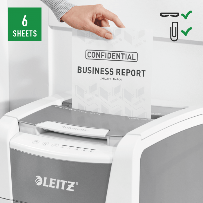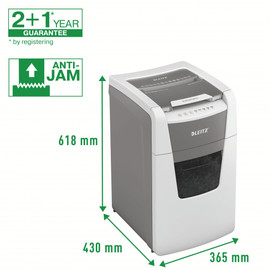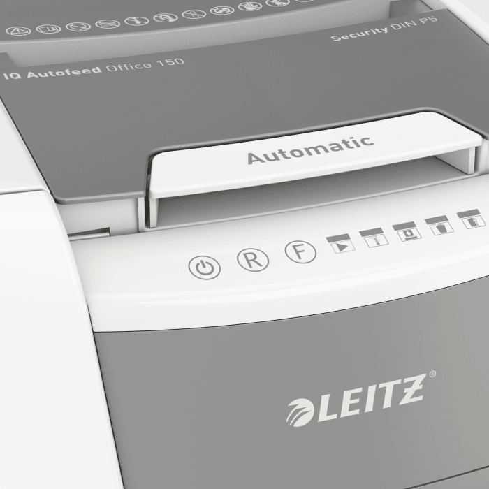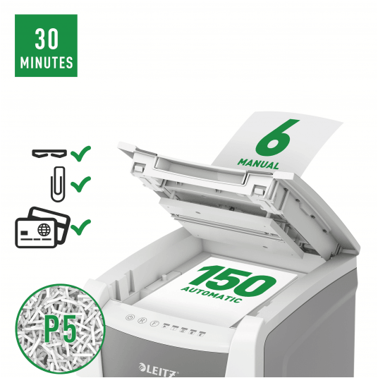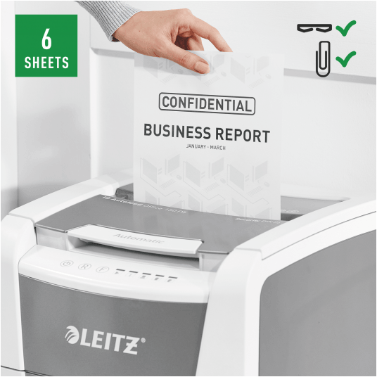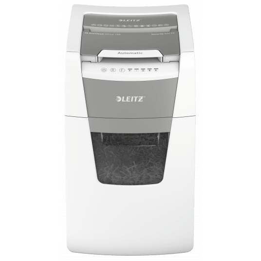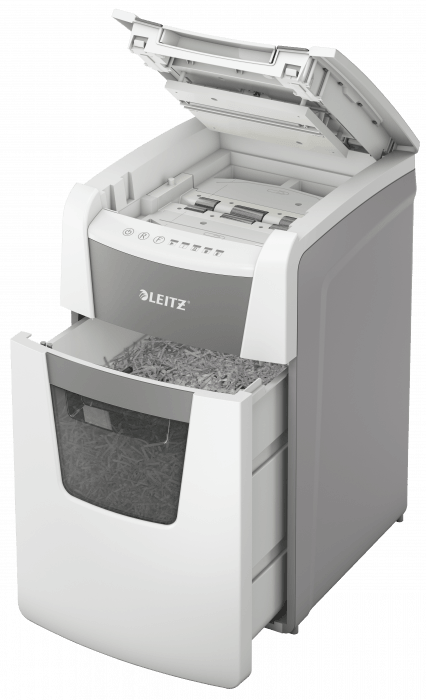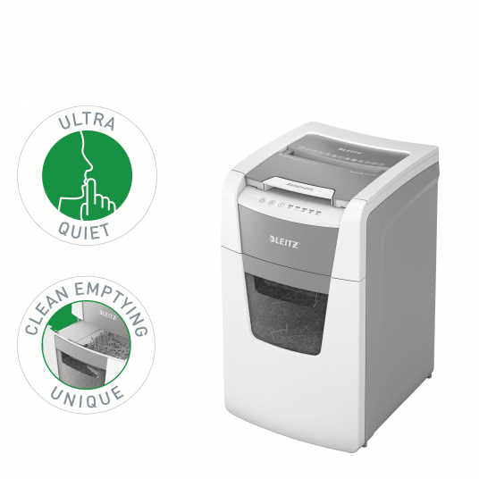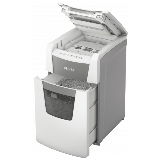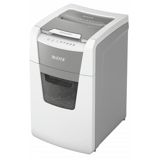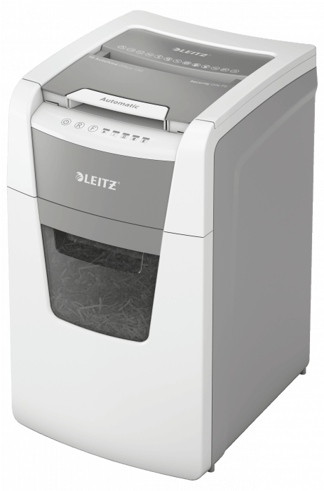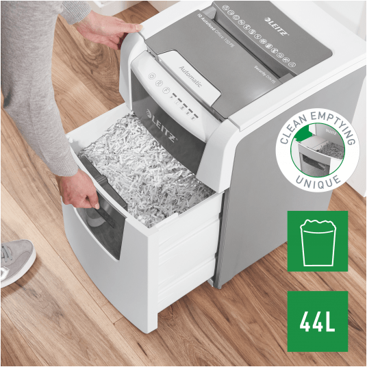 W pełni automatyczna niszczarka do papieru firmy Leitz z unikalną funkcją samooczyszczania. Tak inteligentna, że wystarczy włożyć stos kartek (w tym ze zszywkami i spinaczami), zamknąć pokrywę i można wracać do swoich zajęć, a ona, cicho pracując, wykona samodzielnie zadaną pracę. Idealna do biur. Gwarantuje doskonałą wydajność - zapobiega zacięciom, jest cicha i może pracować przez 30 minut bez przerwy. Jednorazowo niszczy automatycznie do 150 kartek formatu A4, tnąc je na mikrościnki o poziomie bezpieczeństwa P-5 (2 x 15 mm) i umieszczając pocięte arkusze w dużym, 44-litrowym pojemniku. Dotykowy panel sterowania gwarantuje łatwą i intuicyjną obsługę urządzenia.