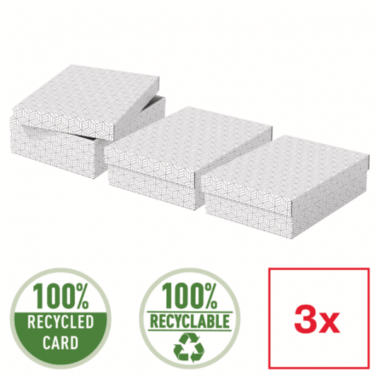 Zestaw trzech nowoczesnych i stylowych tekturowych pudełek ze zdejmowaną pokrywą, idealnych do zapakowania prezentów lub przechowywania zdjęć, dokumentów i innych drobnych przedmiotów. Wykonane z mocnej tektury falistej, w 100% pochodzącej z recyklingu i w 100% nadającej się do ponownego przetworzenia, opatrzonej certyfikatem FSC. Mają gładką, łatwą do czyszczenia powierzchnię z dwukolorowym, geometrycznym wzorem, dopełniającym styl wnętrza. Pudełka są dostarczane na płasko, do samodzielnego złożenia, a ich montaż jest szybki i łatwy. Po złożeniu boki pudełka tworzą podwójne ścianki, dzięki czemu są mocne i dobrze chronią zawartość. Wszystkie mają ten sam rozmiar 265 x 100 x 360 mm.