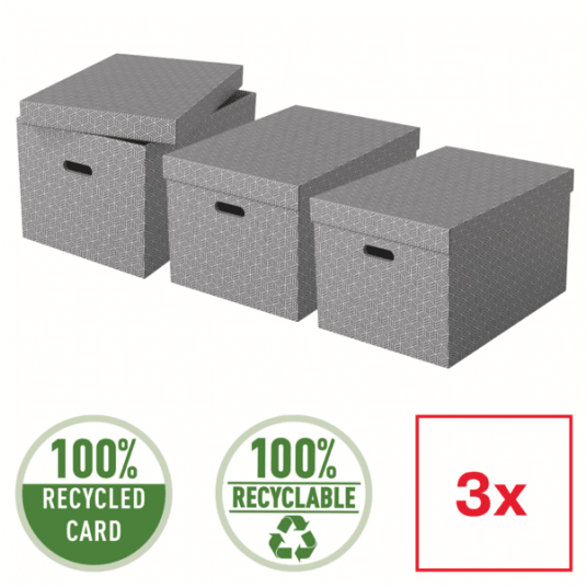 Zestaw trzech nowoczesnych i stylowych tekturowych pudełek ze zdejmowaną pokrywą, idealnych do organizacji nowego miejsca do przechowywania w domu. Można je używać oddzielnie lub ustawiać na półkach i regałach, aby takie rzeczy jak zabawki czy książki były przechowywane w uporządkowany i łatwy do znalezienia sposób. Każde pudełko ma 2 uchwyty, które ułatwiają przenoszenie z miejsca na miejsce, gdy zajdzie taka potrzeba. Wykonane z mocnej tektury falistej, w 100% pochodzącej z recyklingu i w 100% nadającej się do ponownego przetworzenia, opatrzonej certyfikatem FSC. Mają gładką, łatwą do czyszczenia powierzchnię z dwukolorowym, geometrycznym wzorem, dopełniającym styl wnętrza. Pudełka są dostarczane na płasko, do samodzielnego złożenia, a ich montaż jest szybki i łatwy. Po złożeniu boki pudełka tworzą podwójne ścianki, dzięki czemu pudełka są mocne i dobrze chronią zawartość. Wszystkie mają ten sam rozmiar 355 x 305 x 510 mm.