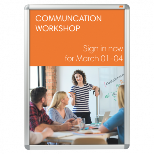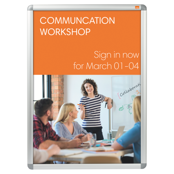 Odporne na warunki atmosferyczne zatrzaskowe ramy i stojaki Nobo są łatwe w użyciu i umożliwiają idealną prezentację plakatów i innych informacji zarówno wewnątrz budynków, jak i na zewnątrz. Wyposażone w antyodblaskową osłonę z PVC, która chroni przed kurzem i zabrudzeniami oraz aluminiową ramę zapewniającą estetyczny wygląd. Korzystaj z ram i stojaków z zatrzaskiem, aby dbać o skoordynowany i estetyczny wygląd Twoich ogłoszeń. Format A1.