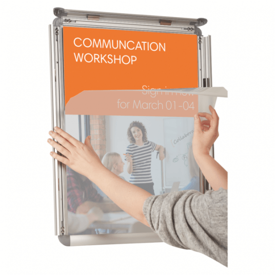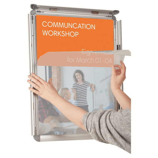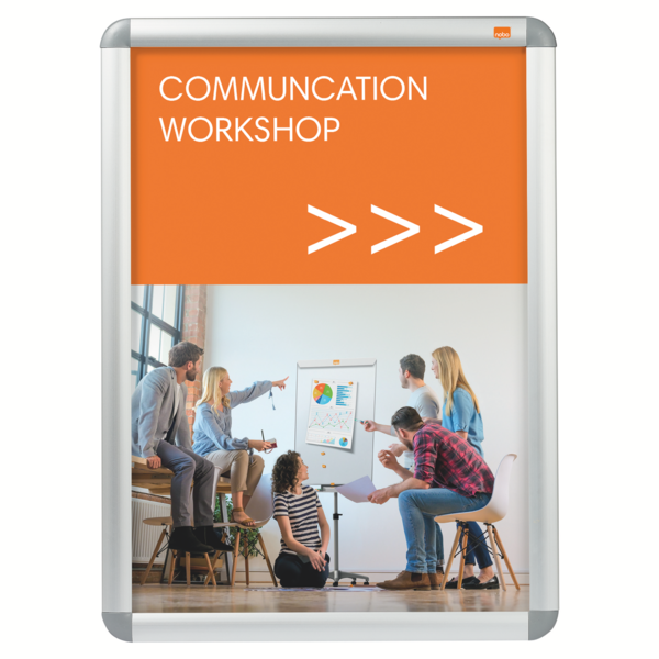 Odporne na warunki atmosferyczne zatrzaskowe ramy i stojaki Nobo są łatwe w użyciu i umożliwiają idealną prezentację plakatów i innych informacji zarówno wewnątrz budynków, jak i na zewnątrz. Wyposażone w antyodblaskową osłonę z PVC, która chroni przed kurzem i zabrudzeniami oraz aluminiową ramę zapewniającą estetyczny wygląd. Korzystaj z ram i stojaków z zatrzaskiem, aby dbać o skoordynowany i estetyczny wygląd Twoich ogłoszeń. Format A2.