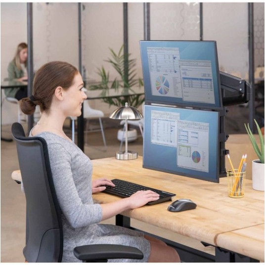 W pełni niezależne, regulowane ramię na 2 monitory Platinum Series™ (w układzie pionowym) w kolorze czarnym, z technologią sprężyny gazowej, która umożliwia łatwe dostosowanie monitora do pracy oraz współdzielenie ekranu: – pozwala na zwiększenie ilości wolnego miejsca na biurku, przeciwdziałając zmęczeniu oczu, szyi i ramion, – umożliwia łatwą regulację za sprężyny gazowej, dzięki której szybko i precyzyjnie zmienisz położenie monitora, z możliwość obrotu ramienia o 360° i nachylenia ekranu monitora od -45° do 45°, – wyposażone w 2 porty USB typu A, umożliwiające podłączenie ulubionych urządzeń, – łatwe w montażu za pomocą zacisku do krawędzi biurka lub oczka (przelotki) w blacie, – zapewnia zgodność ze standardem VESA 75×75 i 100×100. Produkt objęty jest 3-letnią (ograniczoną) gwarancją. Produkt przetestowany przez FIRA International Ltd. pod kątem zgodności z wymogami ergonomii określonymi w europejskim prawodawstwie dotyczącym zdrowia i bezpieczeństwa pracy biurowej: EN ISO 9241-5.