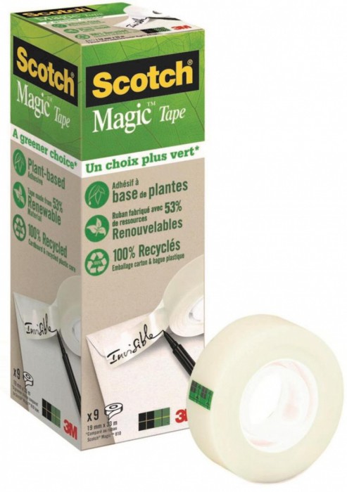 Scotch® Greener Choice to taśma Magic w przyjaznym dla środowiska wydaniu. Idealna do naprawiania i sklejania dokumentów, zaklejania kopert oraz przyklejania zdjęć i grafik. Produkt z certyfikatem OK biobased** w minimum 40% z surowców roślinnych - gwarancja najwyższej dbałości o środowisko. Klej i 53% taśmy wytworzono z surowców roślinnych, a opakowanie i trzpień w 100% z surowców z recyklingu. Matowa na rolce, niewidoczna po naklejeniu na papier, także na fotokopiach, skanach i zdjęciach. Można po niej pisać długopisem, ołówkiem i markerem. Mocny klej, który nie wysycha, a taśma nie żółknie z upływem czasu. Grubość: 56 mikronów, matowa folia Magic™ w 53% z surowców roślinnych, klej syntetyczny akrylowy bez rozpuszczalników na bazie roślin, Adhezja do stali 14 N/cm. Opakowanie zawiera 9 rolek taśmy klejącej Scotch® Magic™ Greener Choice, w rozmiarze 19 mm x 33 m.