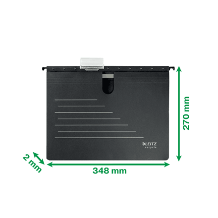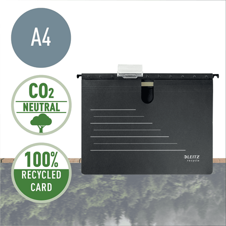 Wykorzystaj maksymalnie przestrzeń do przechowywania, archiwizując dokumenty pionowo w zawieszanych teczkach, zapewniających porządek i łatwy dostęp do dokumentów. Mocne i wytrzymałe zawieszki oraz uchwyty na etykiety do opisu zawartości. Karton w 100% pochodzący z recyklingu, neutralny dla klimatu i w 100% nadający się do ponownego recyklingu. Certyfikat Blue Angel.