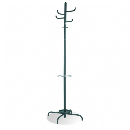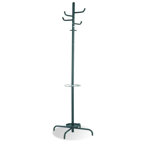 - wykonany z elementów metalowych - posiada uchwyty na parasole i podstawkę na ściekającą z nich wodę - wysokość: 186 cm - stabilna podstawa, średnica: 62 cm - 8 uchwytów na ubrania - chromowany lub malowany proszkowo na kolor czarny lub aluminium