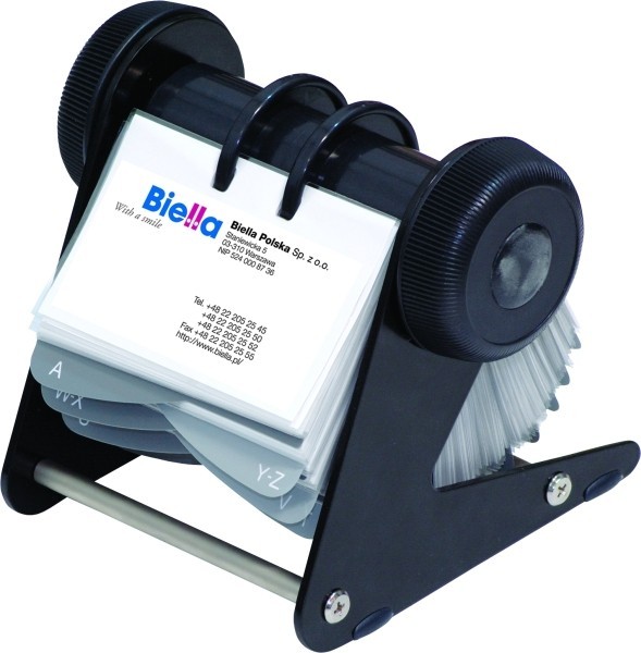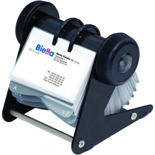 - zawiera 200 koszulek - mieści 400 wizytówek - posiada indeks alfabetyczny - wymiary koszulki: 66 x 103 mm - solidna, metalowa, czarna podstawa