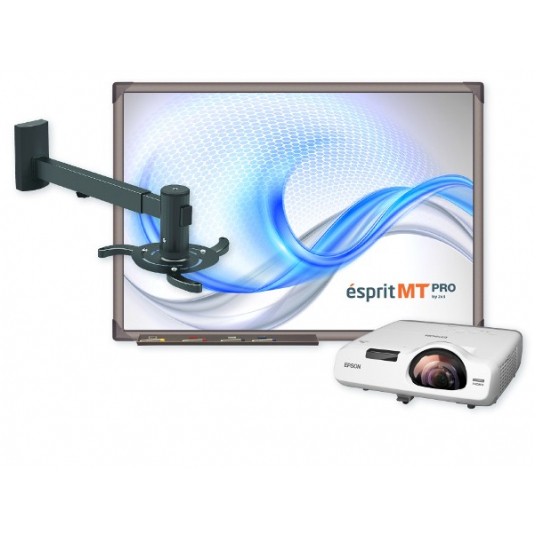 W zestawie: tablica interaktywna ésprit MT Pro, projektor bliskiej projekcji EB-520 (technologia 3LCD, jasność 2700 lumenów światło białe i kolorowe, rozdzielczość 1024 x 768 (XGA), kontrast 16000:1 dystans 0,5 - 1,3 m) oraz uchwyt do projektora US1