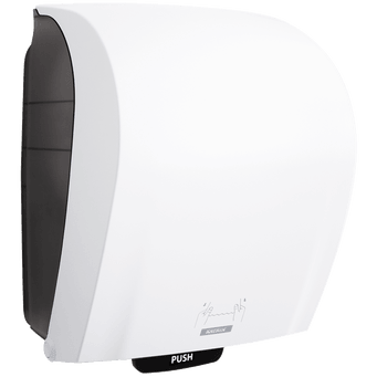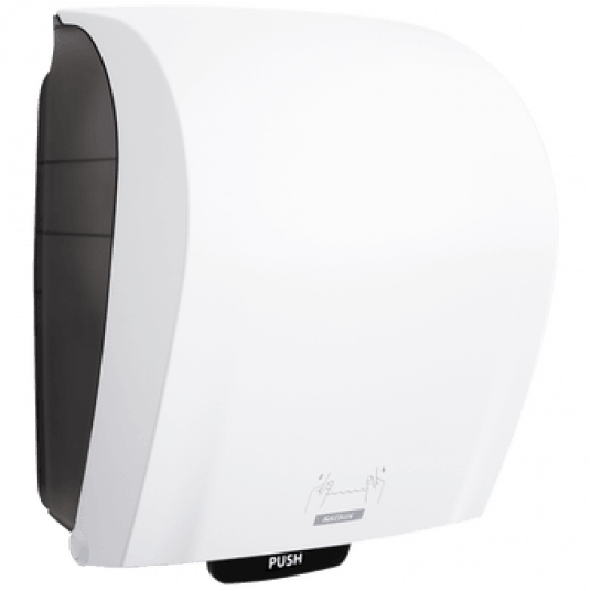 Dozownik - łatwy w użytkowaniu - wygodny przycisk, pokrywa otwierana w dół - mechanizm umożliwiający łatwe odrywanie listków - regulowany mechanizm zapobiegający blokowaniu się urządzenia i regulowane uchwyty rolki Ręczniki - 2-warstwowy, biały - duża ilość papieru na rolce - mniejsze koszty dzięki kontroli zużycia papieru - dopuszczony do bezpośredniego kontaktu z żywnością - posiada certyfikat Nordic Swan Eco Label oraz EU Flower Eco Label