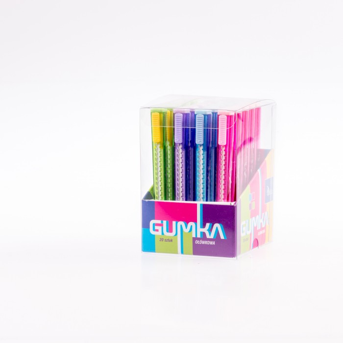 - gumka w obudowie z tworzywa sztucznego - prostokątny kształt zapewnia precyzyjne korygowanie - nie niszcząc ścieranych powierzchni - mechanizm suwaka reguluje wysunięcie gumki - produkt nie zawiera PVC - pakowany w display po 20 szt