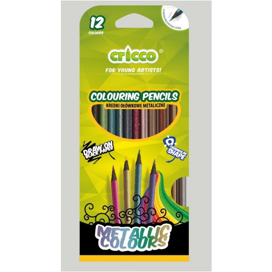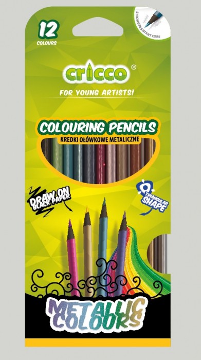 - znakomitej jakości kredki ołówkowe w czarnym drewnie w iskrzących się, metalicznych kolorach - optymalna twardość wkładu zapewnia doskonałe efekty bez konieczności dociskania kredki - w szczególności na ciemnym papierze - trójkątny ergonomiczny przekrój zapewnia komfort użytkowania - w opakowaniu kartonowym z okienkiem i zawieszką