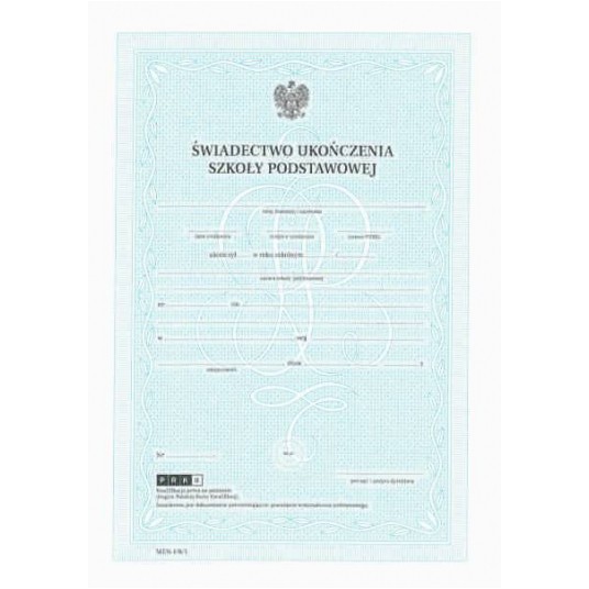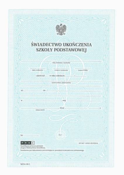MEN-I/8/1 - Świadectwo ukończenia szkoły podstawowej dla dzieci i młodzieży oraz dla słuchaczy szkoły podstawowej dla dorosłych zawierające znak graficzny PRK II Typograf A4 (2 str.)
