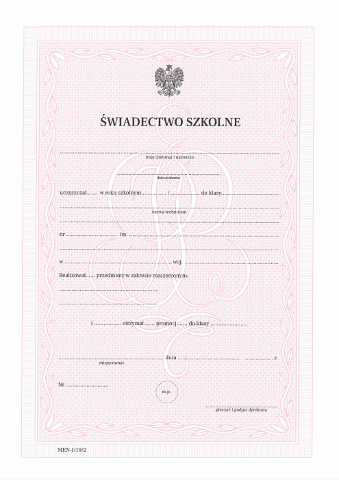 MEN-I/19/2 - Świadectwo szkolne promocyjne dla uczniów technikum Typograf A4 (4 str.)