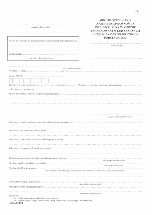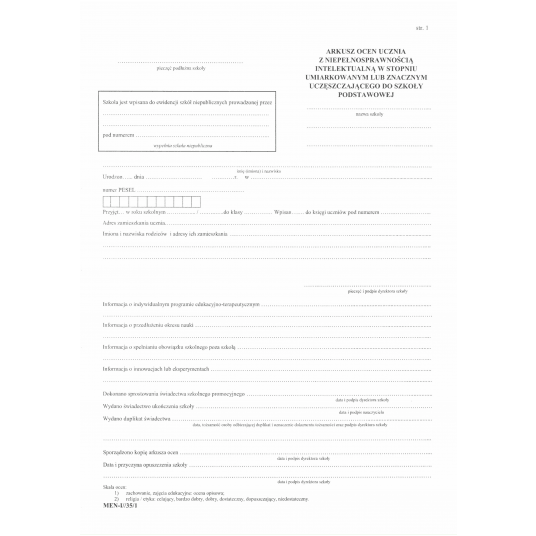 MEN-I/35/1 - Arkusz ocen dla uczniów z niepełnosprawnością intelektualną w stopniu umiarkowanym lub znacznym, uczeszczających do szkoły podstawowej Typograf A4 (10 str.)