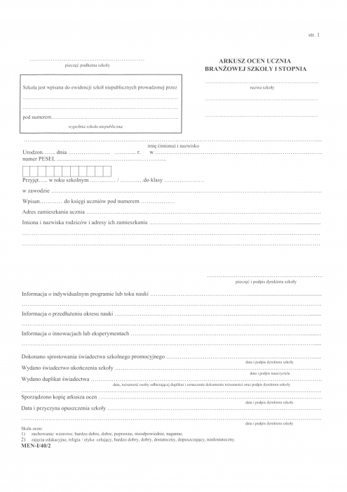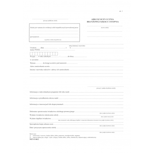MEN-I/40/2 - Arkusz ocen dla uczniów szkoły branżowej I stopnia Typograf A4 (6 str.)