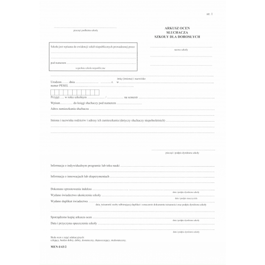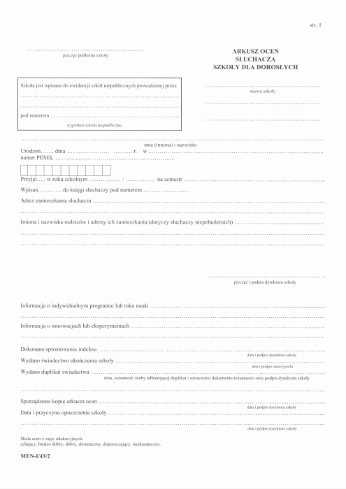 MEN-I/43/2 - Arkusz ocen dla słuchaczy szkoły dla dorosłych Typograf A4 (6 str.)