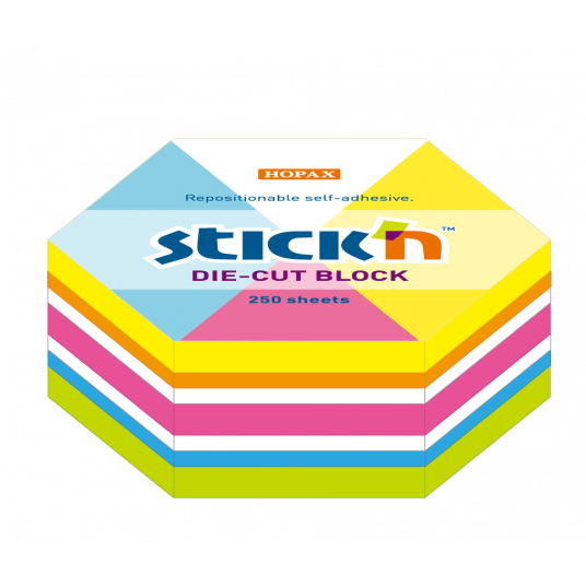 - notes samoprzylepny kostka w kształcie sześciokąta o wymiarach 61 x 70 mm