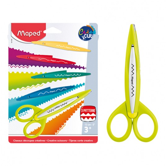 - plastikowe nożyczki kreatywne z 5 rodzajami wymiennych ostrzy do wycinania różnych wzorów - doskonała zabawka rozwijająca zdolności manualne dzieci - długość: 13 cm
