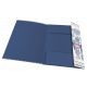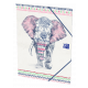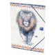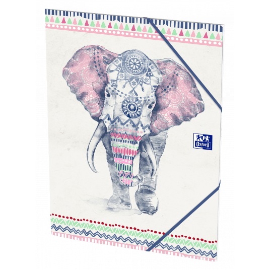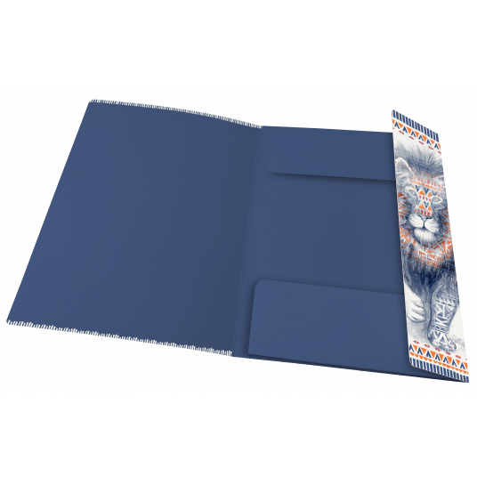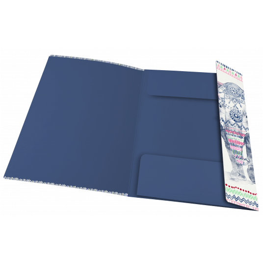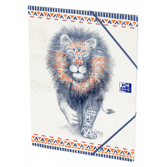 • Wykonane z mocnego, wytrzymałego kartonu o grubości 350 g/m2 • Wbudowane 3 kłapony • Pojemność: ok. 200 kartek • Mix 2 wzorów: słoń i lew • Zamykane na 2 elastyczne gumki • Gumki zamykające oraz wnętrze teczek w kolorze granatowym • Format A4