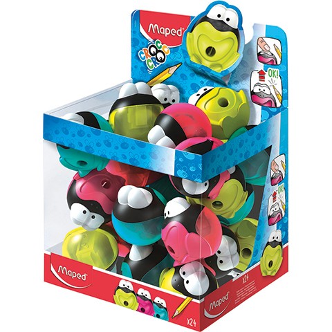 - w kształcie żabki, która otwiera oczy sygnalizując kiedy kredki i ołówki są zatemperowane - trzy wersje kolorystyczne: zielono-czarna, różowo-czarna i niebiesko-czarna - jeden otwór, pojemniczek na ścinki