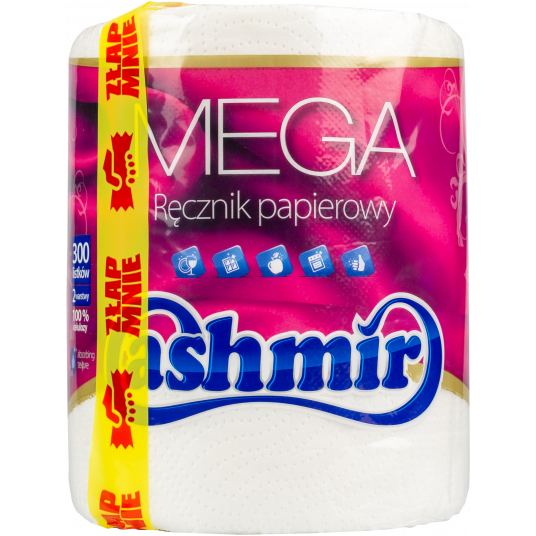 Ręcznik papierowy MEGA 300 listków Cashmir został wykonany w 100 % z naturalnej celulozy, co sprawia, że jest ekologiczny i przyjazny dla środowiska. Maksymalnie długi i bardzo chłonny, dzięki dwuwarstwowej strukturze, jest niezastąpiony podczas wszelkich domowych prac, choć sprawdzi się także podczas większych remontów czy robót budowlanych. Ręcznik papierowy MEGA 300 listków Cashmir to także doskonałe rozwiązanie dla lokali gastronomicznych czy publicznych placówek zbiorowego żywienia jak szkoły, przedszkola i szpitale. Główne cechy ręcznika papierowego Giga 500 listków Cashmir to między innymi: w 100 % z naturalnej celulozymaksymalnie długi - 300 listków