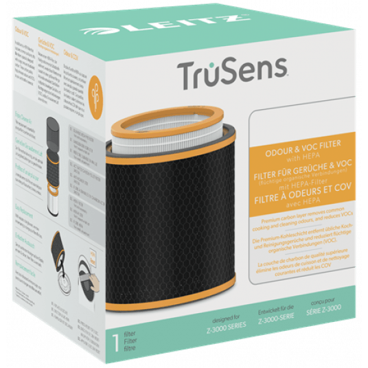 Kompleksowy system filtrów pomaga zwalczać zapachy powstające podczas gotowania i sprzątania oraz redukuje unoszące się w powietrzu LZO, takie jak amoniak, aceton i formaldehyd. 3-poziomowy system składa się z przeznaczonego do mycia filtra wstępnego z siatki mesh, filtra HEPA i trzywarstwowego filtra węglowego w granulkach. Ponadto filtr HEPA, który jest głównym elementem oczyszczacza, wychwytuje 99,97% typowych zanieczyszczeń unoszących się w powietrzu. Aby oczyszczacz powietrza działał jak najlepiej, zaleca się wymianę filtra bębnowego HEPA co 12 miesięcy (w zależności od intensywności użytkowania). Przeznaczony do dużych oczyszczaczy powietrza Leitz TruSens Z-3000 / Z-3500.