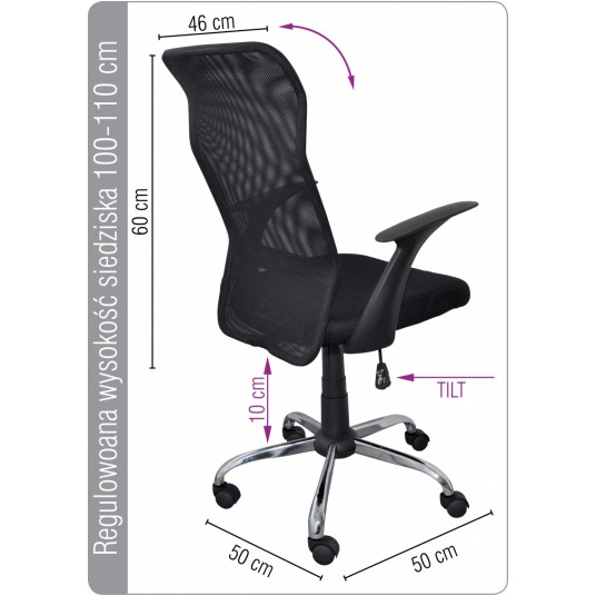 - fotel biurowy z funkcją regulacji wysokości oraz kołyski - wykonany z tkaniny membranowej - wymiary siedziska: 50 x 50 cm - wymiary oparcia: 60 x 60 cm