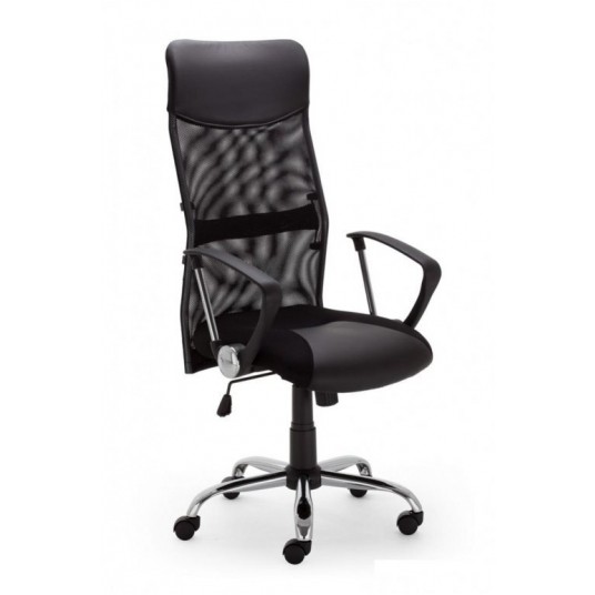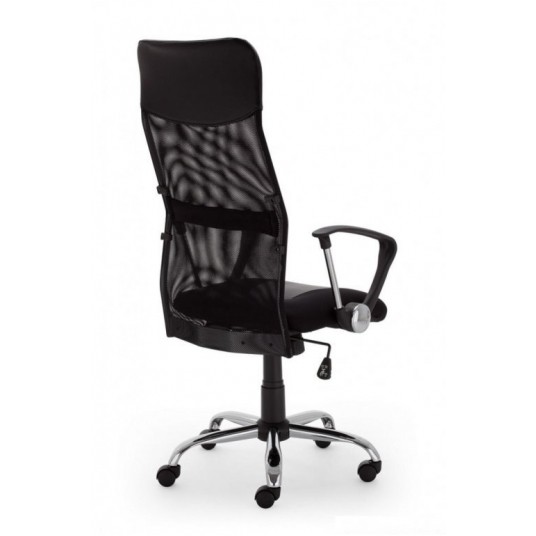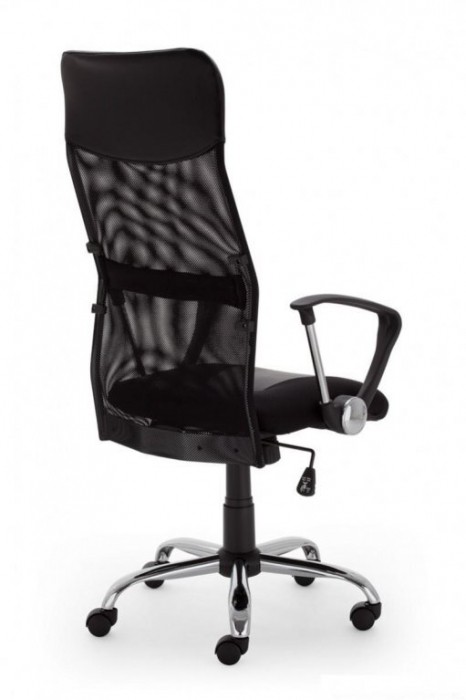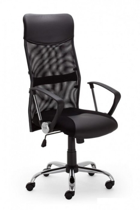 - oparcie i siedzisko tapicerowane połączeniem tkaniny siatkowej i imitacji skóry oraz tkaniny w kolorze czarnym
